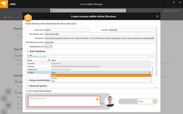 Der Access Rights Manager übernimmt das Berechtigungsmanagement ohne zusätzliche Belastung von Helpdesk oder IT-Administration. Es reicht von der interaktiven Antragstellung via Self Service Portal durch den Anwender, über die Identifikation des verantwortlichen Entscheiders und der revisionssicheren Entscheidungsdokumentation bis hin zur Umsetzung der technischen Änderungen.